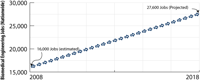 The BLS also states that from 2008-2018, Biomedical Engineers will be the single fastest growing occupation with a projected increase of 72%, which translates into 11,600 new jobs nationwide. This large growth is largely fueled by an aging population and longer life expectancies.